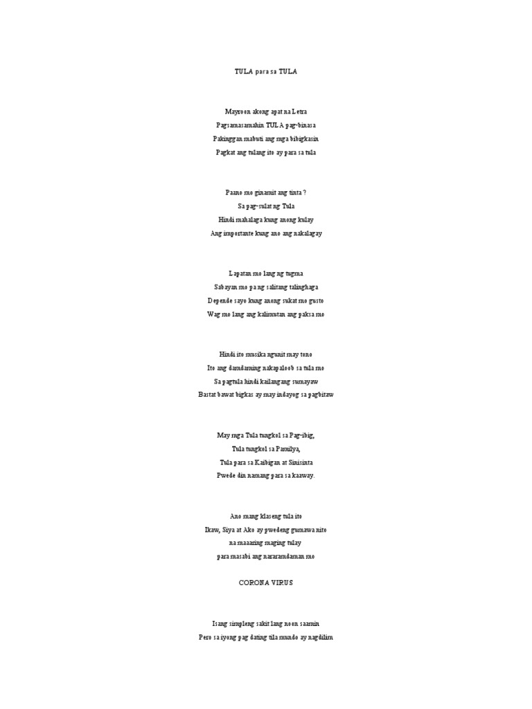 Sa tulang ito sinasaysay ng may akda kung ano ang ibig sabihin ng isang kaibigan. Para Sa Iba Pang Tula At Filipino Lessons. Ang mga tulang ito ay nagbibigay ng mga emosyon na kaugnay sa pag-ibig masaya man o malungkot.