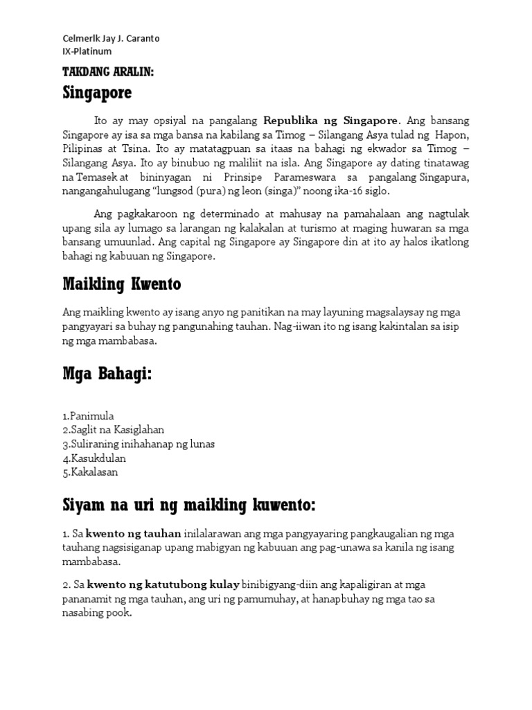 Filipino 9 Modyul 1 Panitikang Asyano Maikling Kwento Ng Singapore Grade 9 Modules